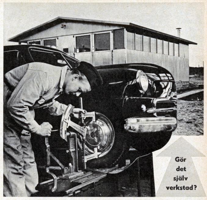 Ovanstående bild är realistisk. Man kan då fråga sig varför de som har sitt näringsfång inom bilismen inte ser lika realistiskt på sin uppgift. Varför försöker man inte i de kretsarna gå de här >>gör det själv>>-bilisterna litet mer till mötes när det gäller arrangemang för service och reparationer. IC har på många platser i vårt land s.k. självbetjäningsstationer, där kunden själv fyller sin bensin och olja, tvättar vindrutan och "luftar". För dessa självtjänster får han bensinen något billigare. Nu väntar vi på fortsättningen. Den enkla men praktiskt inredda och utrustade verkstadslokalen där bilägaren till rimligt pris kan hyra in sig och hyra nödvändiga verktyg för reparationsarbetet. Det behövs inte alls några märkvärdiga arrangemang. En s.k. Termobyggnad, några ordentliga domkrafter, ett ordinärt verktygsskåp och hyggliga belysningsförhållanden. Driften av denna "gör det själv"-verkstad borde kunna skötas av en man – en med någorlunda insikter om bilmotorer.